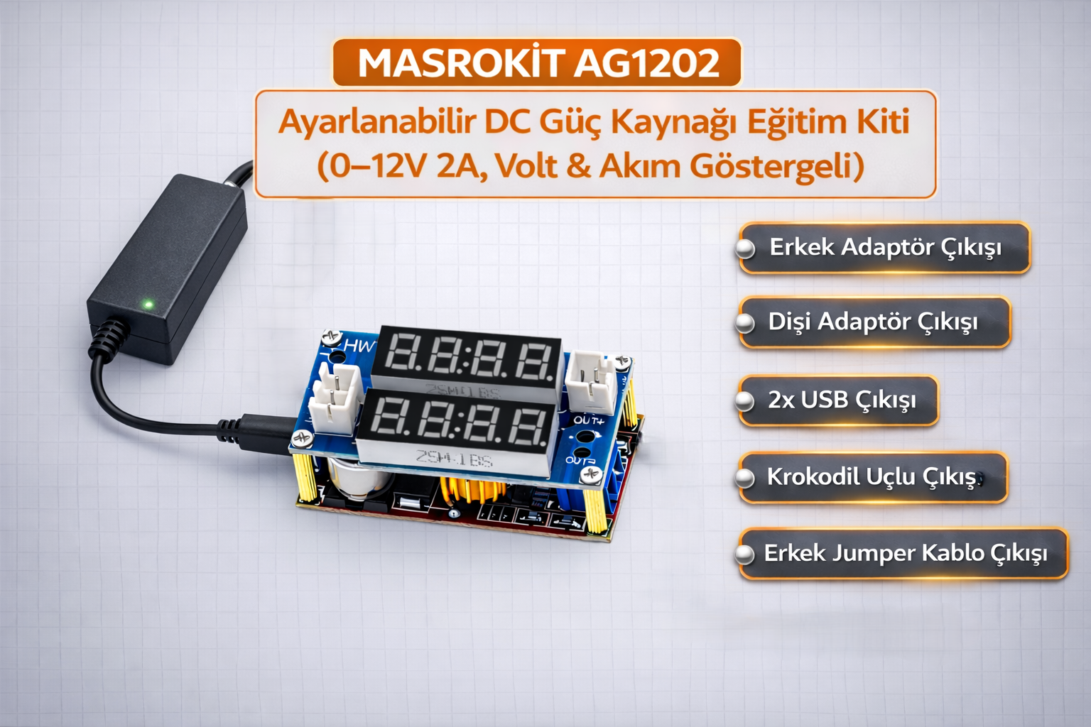 MASROKİT AG1202 Ayarlanabilir DC Güç Kaynağı Eğitim Kiti, elektronik projelerinizde ihtiyaç duyduğunuz kararlı ve ayarlanabilir güç kaynağını pratik şekilde sunar.