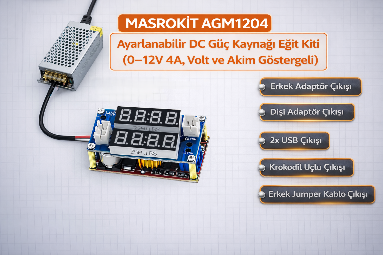 XL4015 5A modül kullanılarak oluşturulan bu eğitim kiti, elektronik projelerde ayarlanabilir ve kontrollü güç kaynağı ihtiyacını karşılamak üzere tasarlanmıştır. Çift ekranlı yapısı sayesinde hem gerilim hem akım değerleri hassas şekilde izlenebilir. Voltaj değeri DC 0-12 V aralığında hassas olarak ayarlanabilir.